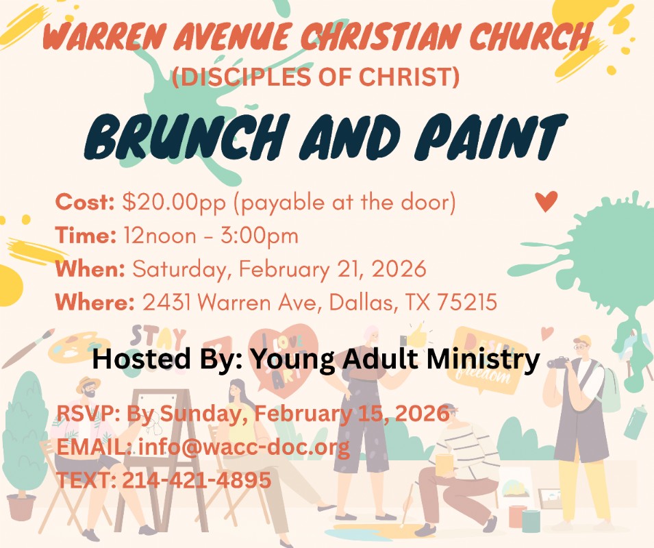 Warren Avenue Christian Church (Disciples of Christ) invites you to join our Young Adult Ministry for Brunch & Paint, a day of good food, creativity, fellowship, and fun. Payment will be taken at the door ($20.00 per person) ... more